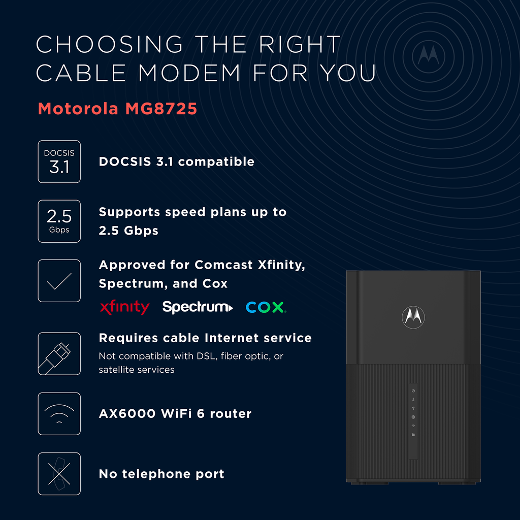 Motorola Multi-Gig Speed DOCSIS 3.1 Cable Modem + WiFi 6 Router | mg8725