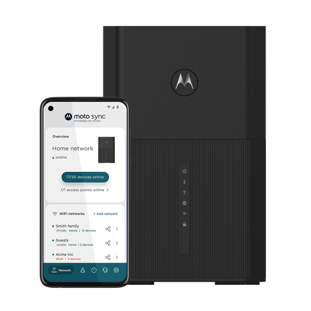 ultra-fast DOCSIS 3.1 cable modemSupports fast internet plans with DOCSIS 3.1, backward compatible with 32x8 DOCSIS 3.0. Features one 2.5 Gig ethernet port and three 1 Gig Ethernet ports for wired connections. warp speed AX6000 4x4 routerPower Boost™, Range Boost, and AnyBeam WiFi beamforming enable whole-home coverage. Supports multi-gigabit speeds, depending on your service plan. bye bye, latencyThis hardware model was the first to Low Latency DOCSIS (LLD) certification by CableLabs, making it LLD ready (requires a firmware update when supported and certified by cable providers). Lower latency reduces lag for the ultimate gaming, streaming, and conferencing experience. superior, but pays for itselfSavings up to $168 per year on modem rental fees. Comes with a 2-year warranty and free support from our US-based technicians. safety. privacy. control.Setup in minutes using the motosync app. Access speed tests, guest network, signal strength, and malware blocking. Create family profiles to filter content, set schedules, monitor usage, and more.