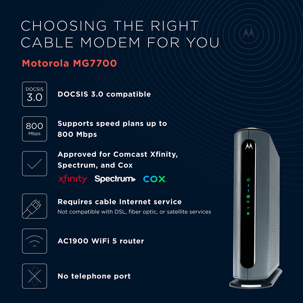 Home / Collections / All / Motorola DOCSIS 3.0 24x8 Cable Modem + WiFi 5 Router, up to 860 Mbps speed | mg7700 - Refurbished